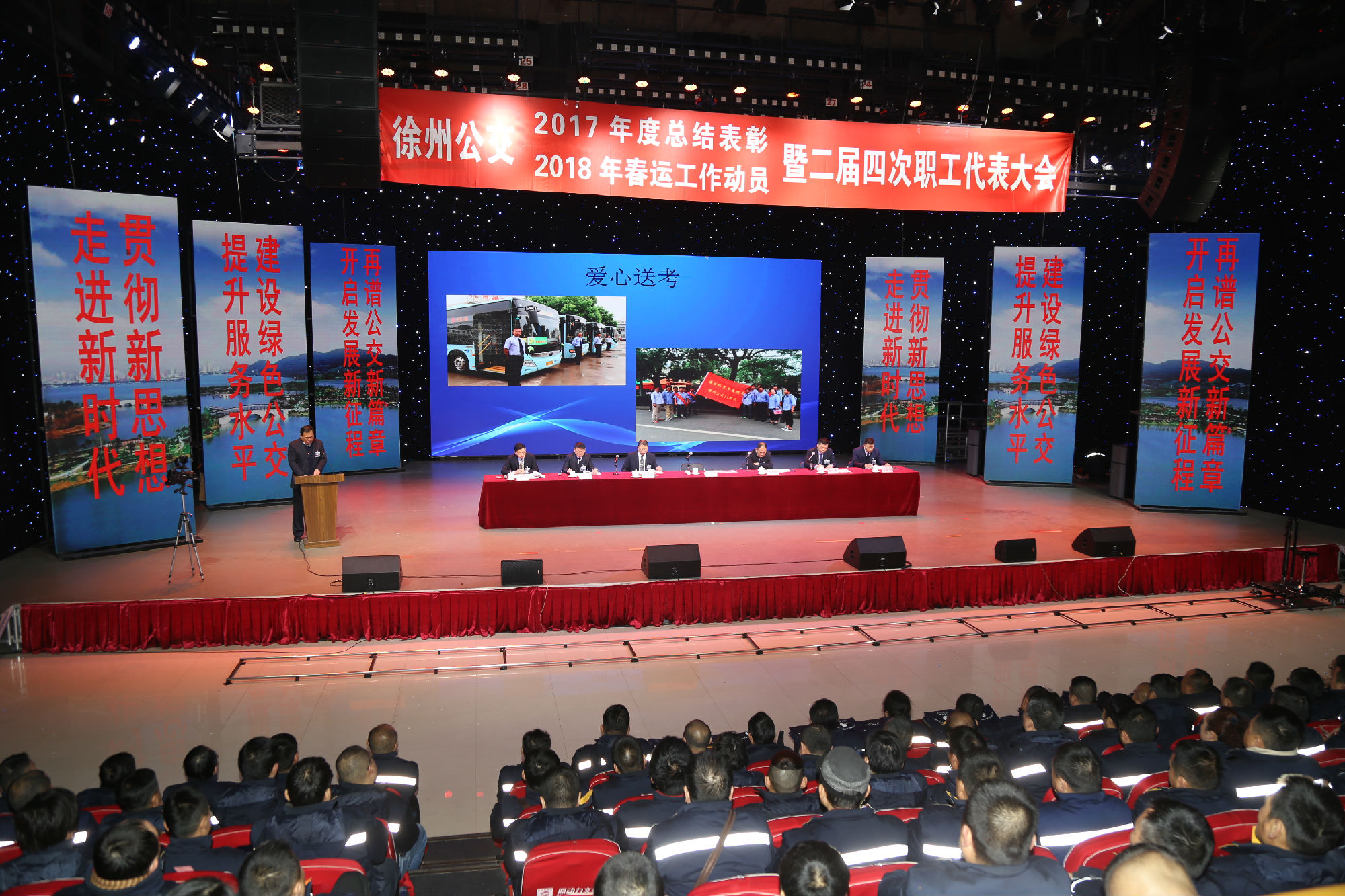 大會在莊嚴(yán)的國歌聲中拉開序幕。公司董事長、總經(jīng)理杜紅軍首先作經(jīng)理工作報告,對2017年“改革創(chuàng)新年”工作進行了全面總結(jié):一、實施“同城同價”,優(yōu)化運營管理,實現(xiàn)服務(wù)水平新突破。連續(xù)第五年面向全市征集線路線網(wǎng)優(yōu)化意見近3000條,據(jù)此新辟優(yōu)化線路29條。二、深化資源共享,在互聯(lián)網(wǎng)+企業(yè)管理上譜寫新藍圖。繼續(xù)深化集中維修,推行集中例檢。論證實施支付寶、微信、銀行卡閃付等智能化移動支付方式。三、深化文明創(chuàng)建,打造優(yōu)秀公交,服務(wù)民生出行贏得新口碑。在國檢、省檢中未失一分,圓滿完成創(chuàng)建驗收任務(wù)。投訴總數(shù)和有責(zé)投訴同比實現(xiàn)“雙下降”。乘客表揚同比上升近20%。公司在2016年行風(fēng)熱線上線單位滿意度評議投票中名列榜首。率先打造公交行業(yè)禮讓斑馬線嶄新形象,圓滿完成公交反恐防暴工作。四、著力綜合管理,聚合內(nèi)生動能,增強企業(yè)發(fā)展新優(yōu)勢。重新修訂2012版管理制度匯編和新版《徐州公交獎懲條例》。五、踐行十九大精神,推進和諧發(fā)展,開創(chuàng)黨群工作新面貌。接著,杜總分析了工作中存在的問題,提出下步工作重點。一、建設(shè)現(xiàn)代化公交,提升經(jīng)營管理水平,保障企業(yè)良性有序運行;二、踐行集約共享理念,深化科技應(yīng)用,開創(chuàng)公交事業(yè)發(fā)展新局面;三、建設(shè)平安公交,提升服務(wù)口碑,展示文明公交新形象;四、踐行十九大精神,構(gòu)建和諧公交,開啟黨群工作新面貌。