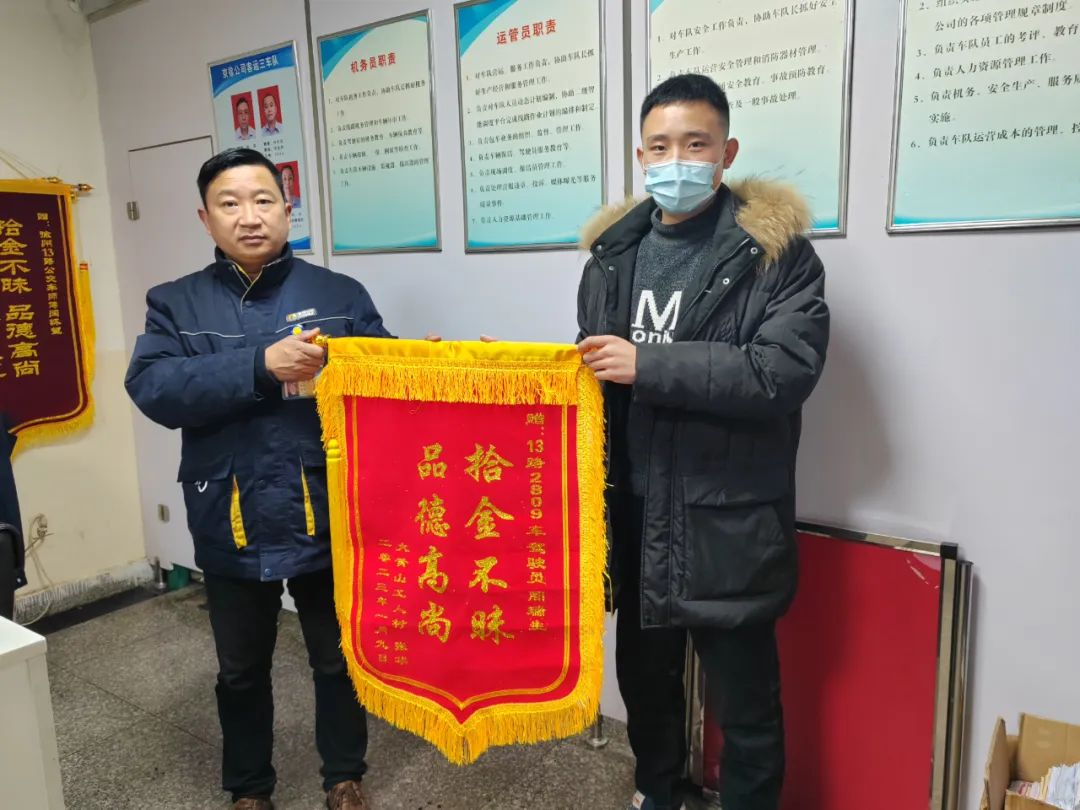 1月19日,失主郭女士通過(guò)公交集團(tuán)熱線電話聯(lián)系到車(chē)隊(duì)管理人員,經(jīng)過(guò)車(chē)隊(duì)的查詢落實(shí)后,郭女士與工作人員約好時(shí)間前來(lái)取回失物。1月20日,郭女士送來(lái)了一面錦旗錦旗,并撥打了熱線電話12345表?yè)P(yáng)駕駛員王怡拾金不昧的精神。王怡熱心助人的行為充分體現(xiàn)了徐州公交駕駛員高尚的道德品質(zhì),他用實(shí)際行動(dòng)體現(xiàn)了 “向善、向美、向上”的價(jià)值追求,在平凡的崗位上傳遞公交正能量。